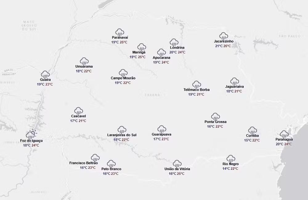 Ainda conforme a Climatempo, a massa de ar frio que acompanha a frente fria deve provocar amanhecer com temperaturas mais baixas, especialmente nas regiões Sul e Leste. Cidades como General Carneiro, União da Vitória e Guarapuava podem registrar mínimas próximas de 11°C. À tarde, os termômetros sobem, e municípios como Foz do Iguaçu, Porecatu e Cornélio Procópio podem se aproximar dos 30°C.